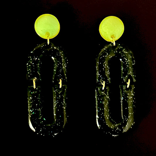 "Space Case" Bright yellow and dark teal multicolored glitter glow-in-the dark resin earrings