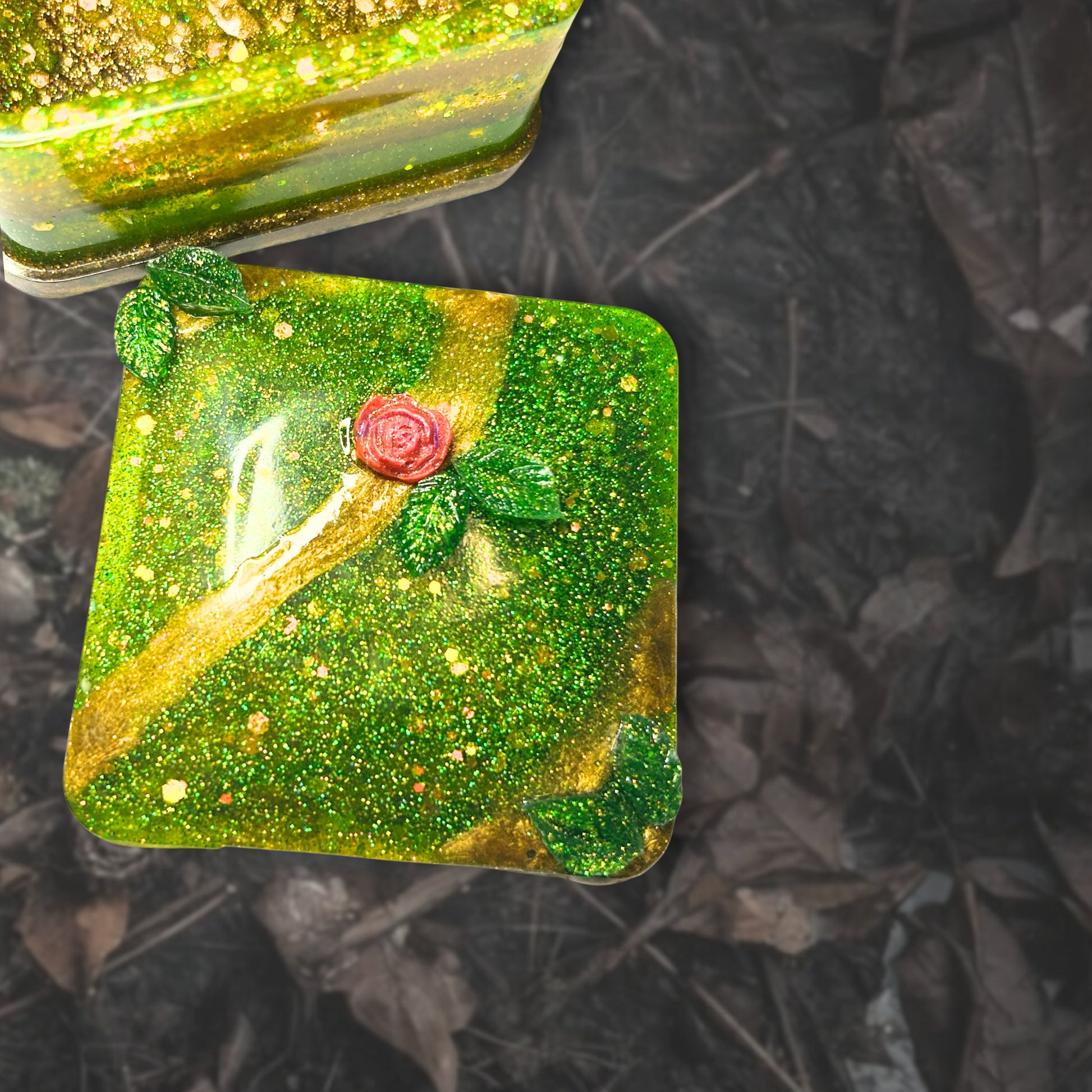 Once upon a time, a jewelry box emerged from an enchanted forest. Its sparkling green surface gleams with magic, crowned by a golden stripe that shimmers like starlight. A blooming resin rose and verdant leaves rest upon the lid, guarding the precious treasures within—a fairytale sanctuary.