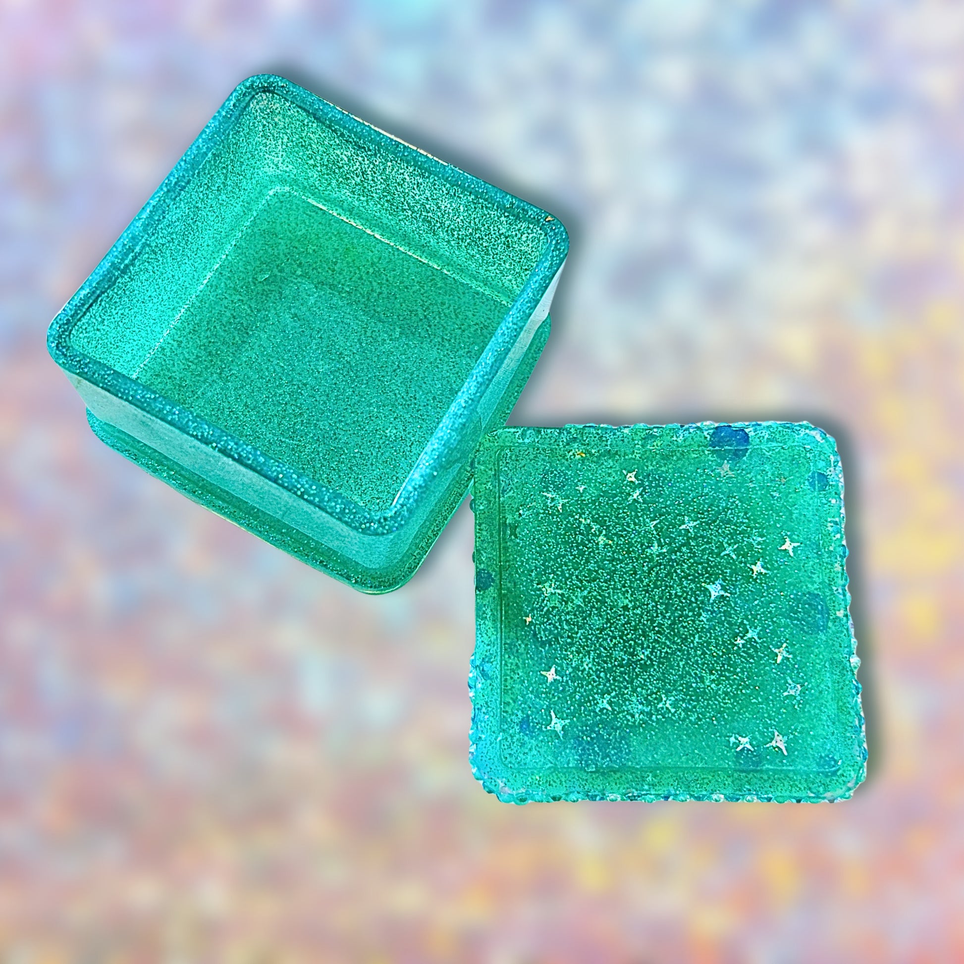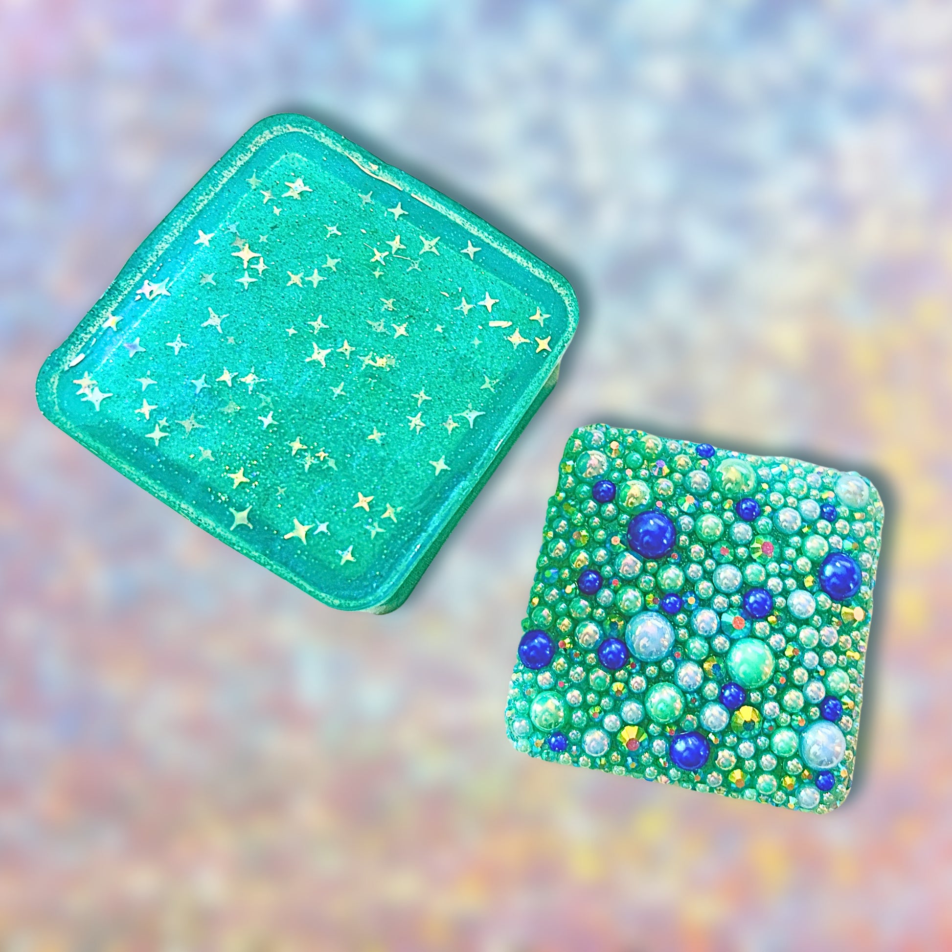 Glittery Square Aqua and Teal Resin Jewelry Box Covered with Pearls and Rhinestones