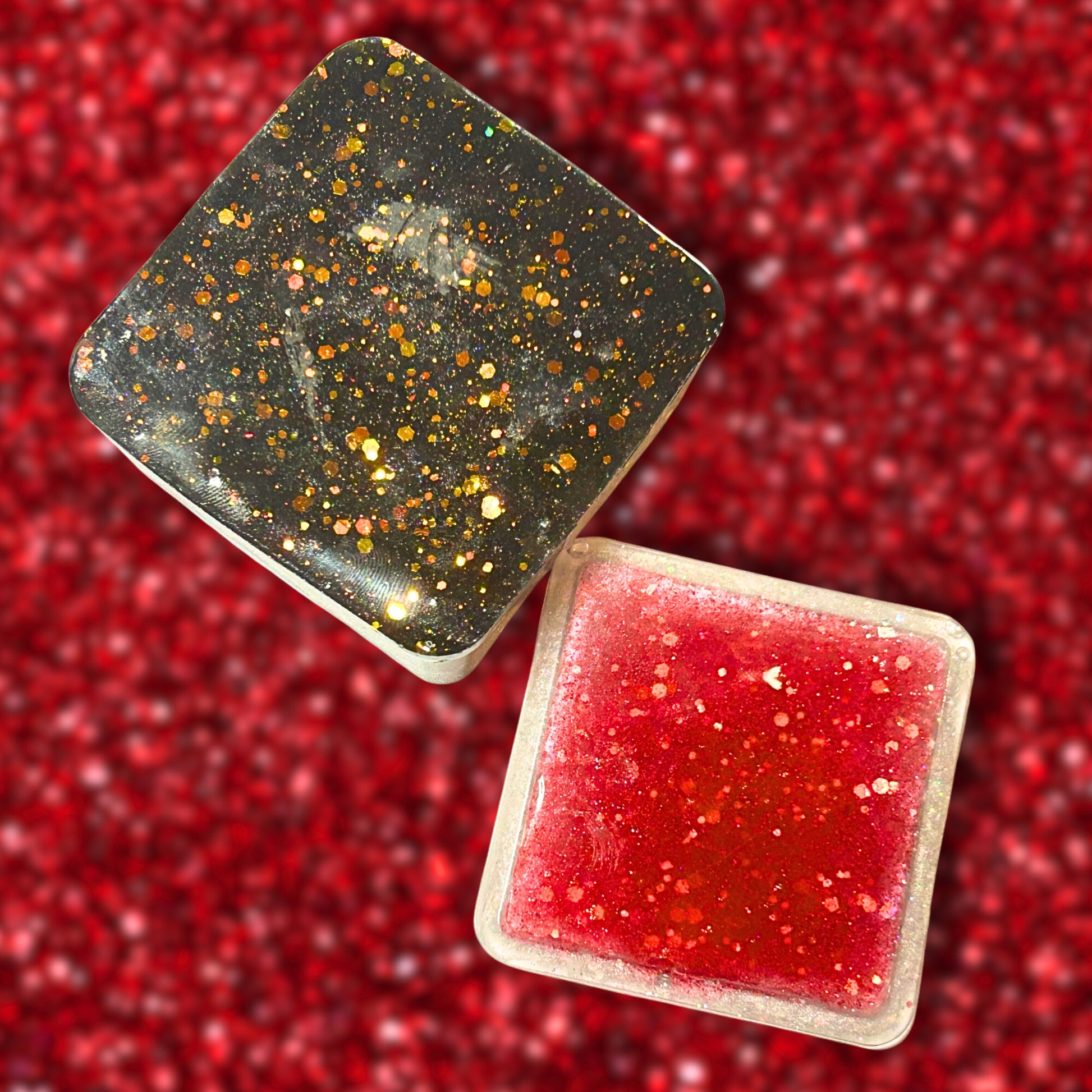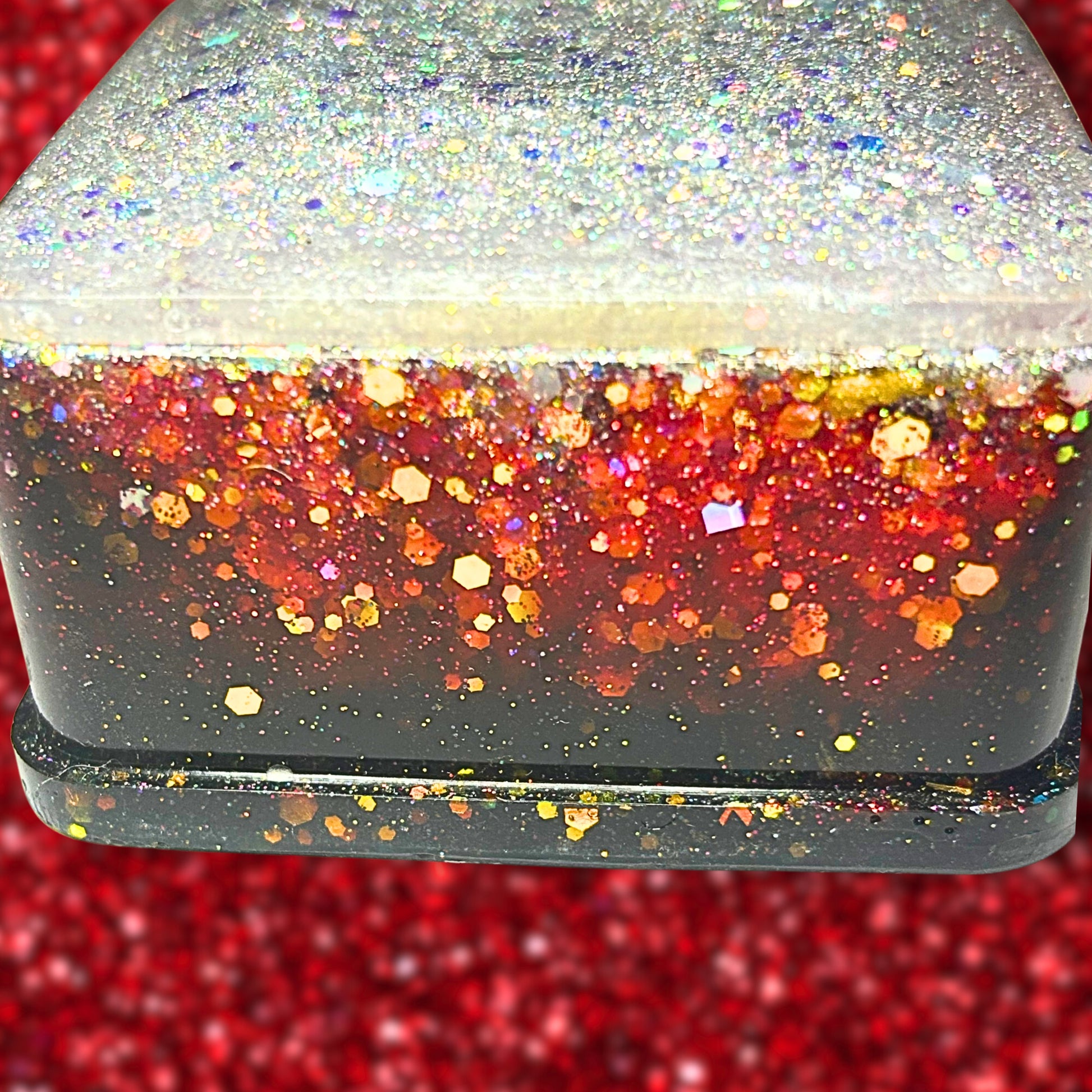 Make a statement with this audacious square jewelry box that refuses to fade into your dresser drawer. Holographic silver glitter shimmers with an iridescent edge, while striking red and black resin creates a bold look. Store your most coveted pieces in a box that matches your confidence like you're 22 all over again! This isn't just storage—it's a declaration that your accessories deserve to be seen and celebrated.