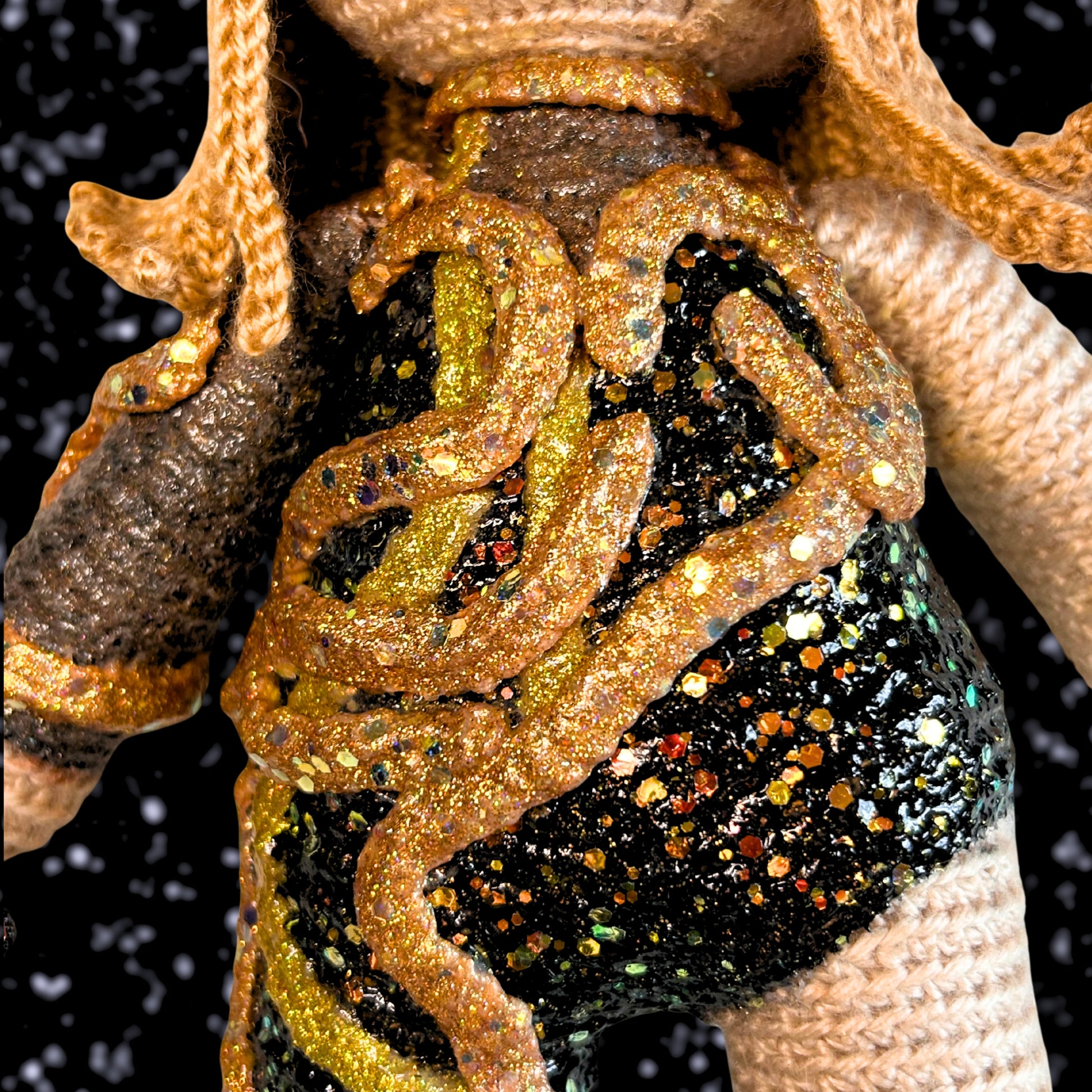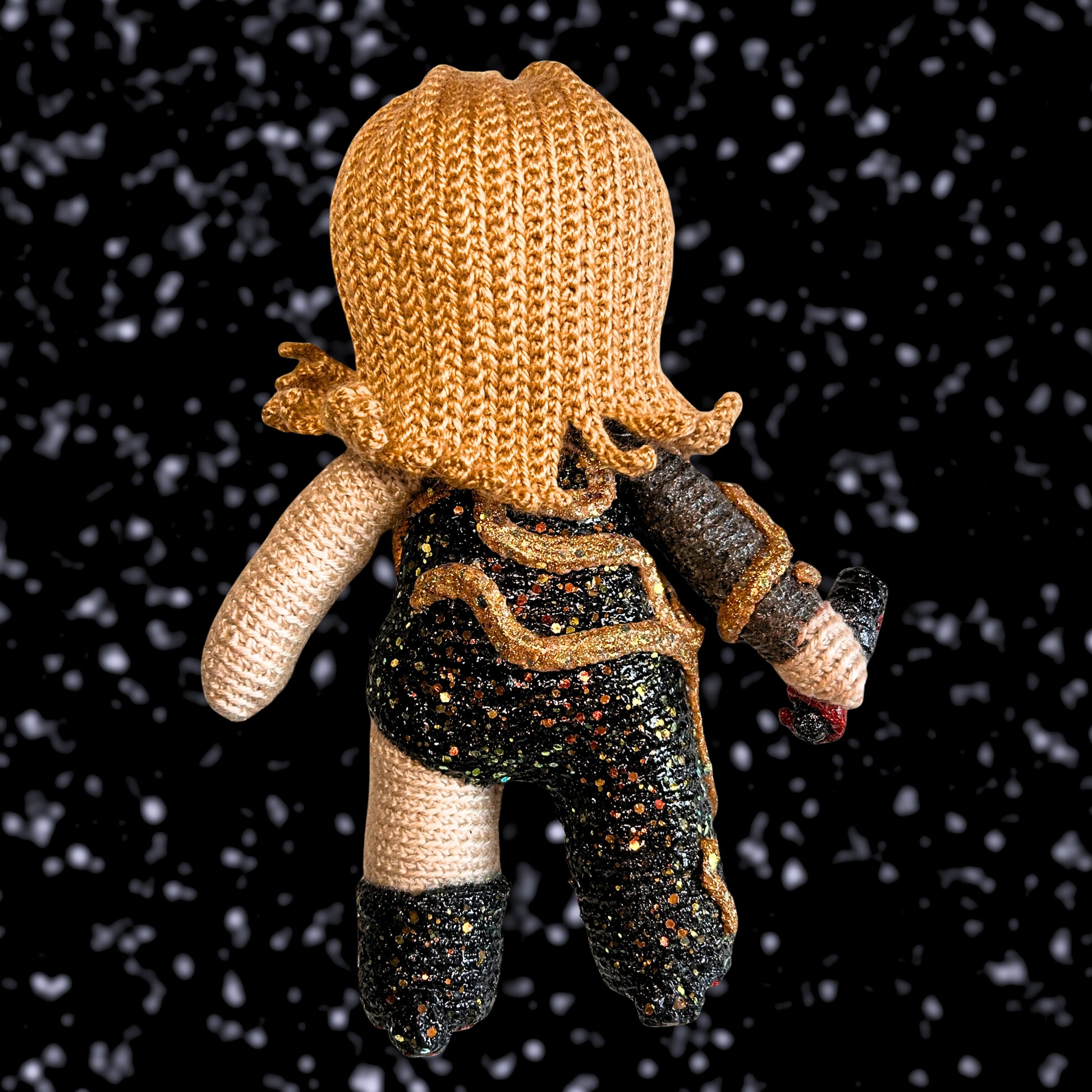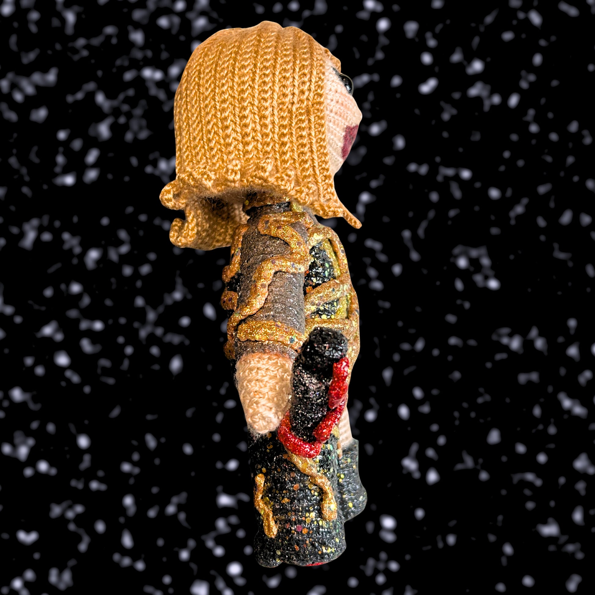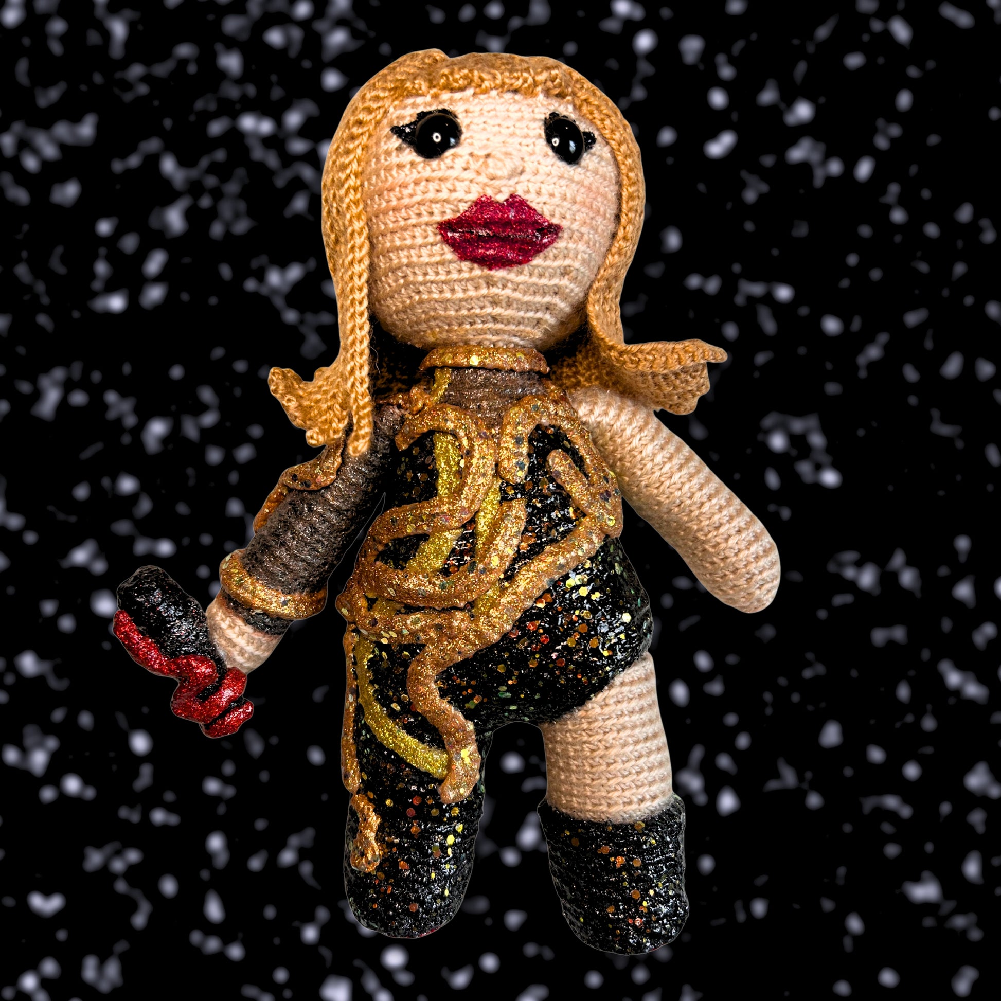 Serenader Number Four is here to protect her good name! This crocheted doll features bold red glitter lips, and sharp wing eyeliner that mean business. She's styled in an edgy gold and black bodysuit with matching ankle boots for maximum impact. The magnetic microphone adorned with a menacing red snake? Detachable and ready for any power pose.