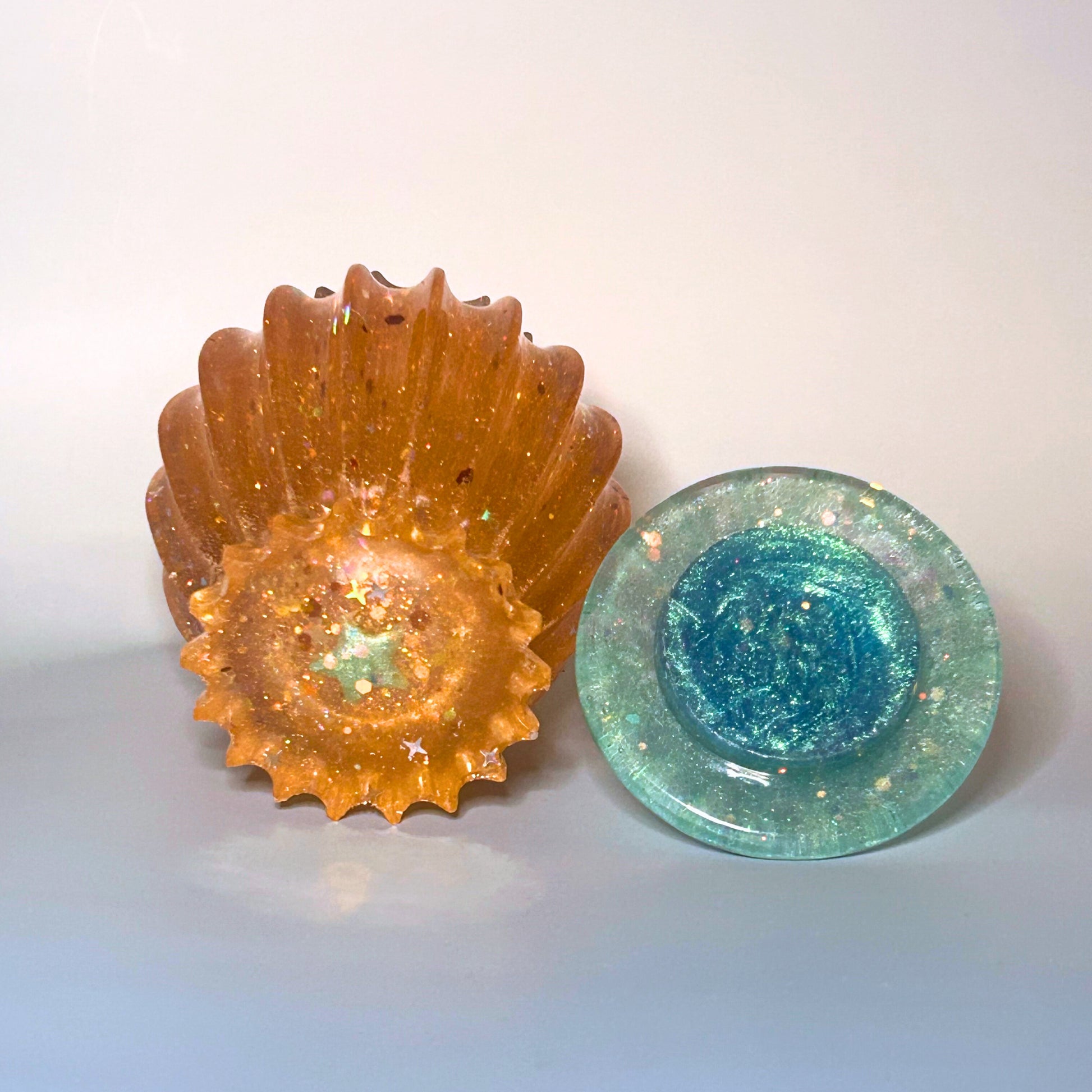 Add some true glam to your space with this "Showbiz Reign" jar! Its and ribbed, see-through form. Oozing with sparkle and shine thanks to its iridescent showbiz-orange glitter, it's the perfect eye-catching accent. Topped with a pointy shimmering aquamarine, glittery lid, this jar is the ultimate addition to your fancy decor (or excuse to throw in some MORE sparkle). It's also a great place to put even more tiny stuff.